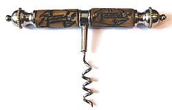 Tire-bouchon avec poignée composée de 2 tubes en os (?) décorés de motifs poissons stylisés, glissés sur un axe fileté entourant la mèche et maintenus par 2 embouts chromés . Fabrication récente. Il semblerait que ce type de montage de tire-bouchons viendrait d'Inde. Toute idée sur l'origine est la bienvenue.