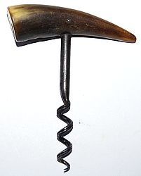 Petit tire-bouchon, poignée en corne. Mèche cannelée en queue de cochon à larges spires, longueur 8cm. Date des années 1930. Référence bibliographique: "Bull's Pocket guide" de Don Bull, page 120. M'a été offert par Joël de Villegouin (Indre).